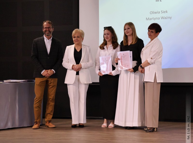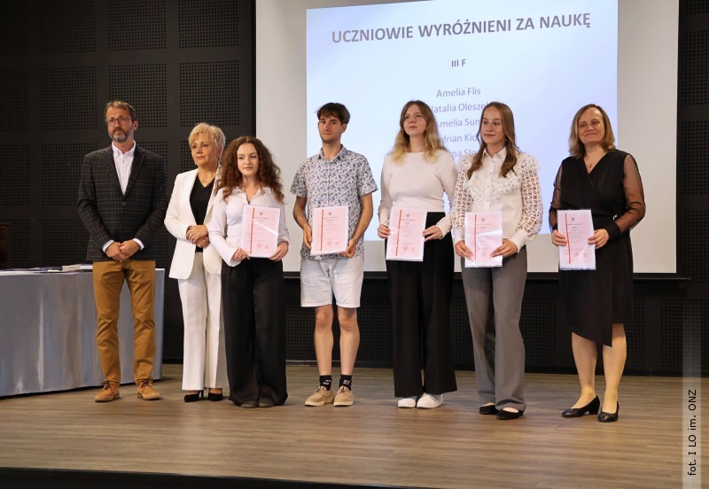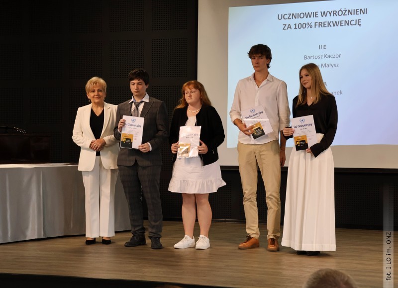 27 czerwca w auli I Liceum Ogólnokształcącego im. ONZ w Biłgoraju odbyło się uroczyste zakończenie roku szkolnego 2024/2025. Z tej okazji swoją obecnością zaszczycili goście: starosta Biłgorajski Andrzej Szarlip oraz przewodniczący Rady Rodziców Jarosław Świtała. Tegoroczną uroczystość rozpoczęła wzruszająca chwila - pożegnanie nauczycieli odchodzących na emeryturę. Dyrektor Jolanta Rycyk podziękowała Wojciechowi Krawcowi, Krzysztofowi Litwiniukowi i Jolancie Tor za wszystkie lata pracy, życzliwość, zaangażowanie i trud włożony w wychowanie wielu pokoleń młodzieży oraz oddanie sprawom szkoły, młodzież wręczyła kwiaty, a wszyscy zebrani wyrazili wdzięczność gromkimi brawami.