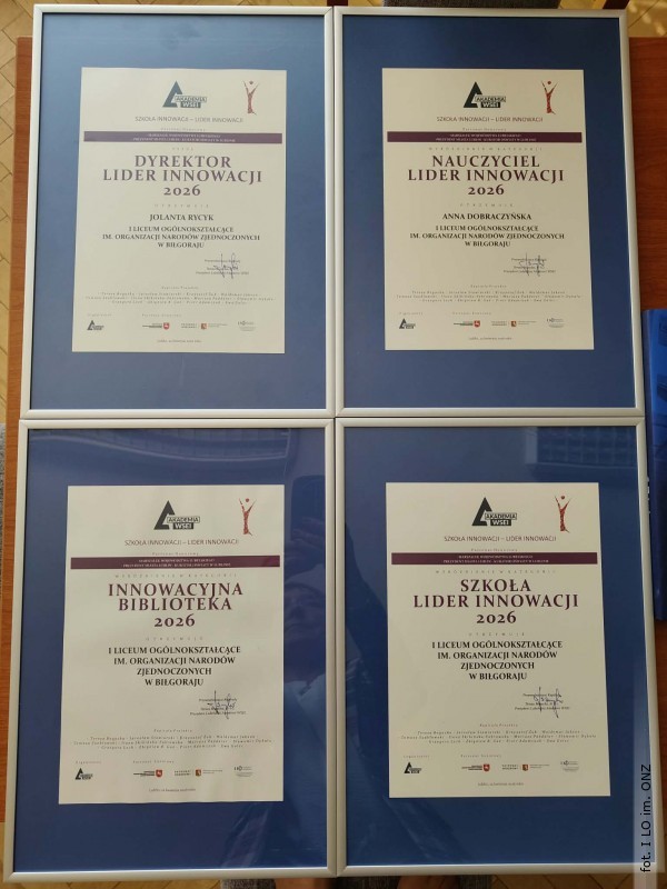 Podczas uroczystej gali konkursu "Szkoła Innowacji 2026" zorganizowanej 22 kwietnia w Wyższej Szkole Ekonomii i Innowacji w Lublinie nagrodę główną w kategorii "Dyrektor - Lider Innowacji" otrzymała dyrektor I Liceum Ogólnokształcącego im. ONZ w Biłgoraju Jolanta Rycyk. Wyróżnienie w kategorii "Nauczyciel - Lider Innowacji" uzyskała Anna Dobraczyńska. Z kolei w kategorii "Innowacyjna Biblioteka" została wyróżniona szkolna biblioteka I LO im. ONZ. Przez Kapitułę Konkursu docenione zostały także wszystkie podejmowane w szkole działania, czego dowodem jest przyznane wyróżnienie w kategorii "Szkoła - Lider Innowacji 2026".