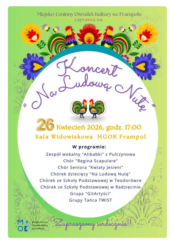 Koncert "Na Ludową Nutę"![]() Gdzie: Frampol, MGOK Kiedy: 2026.04.26, godzina 17:00 Opis: Już 26 kwietnia 2026 r. o godz. 17:00 w sali widowiskowej MGOK w Frampolu odbedzie się koncert "Na Ludową Nutę". W programie wystąpią: ![]() REKLAMA